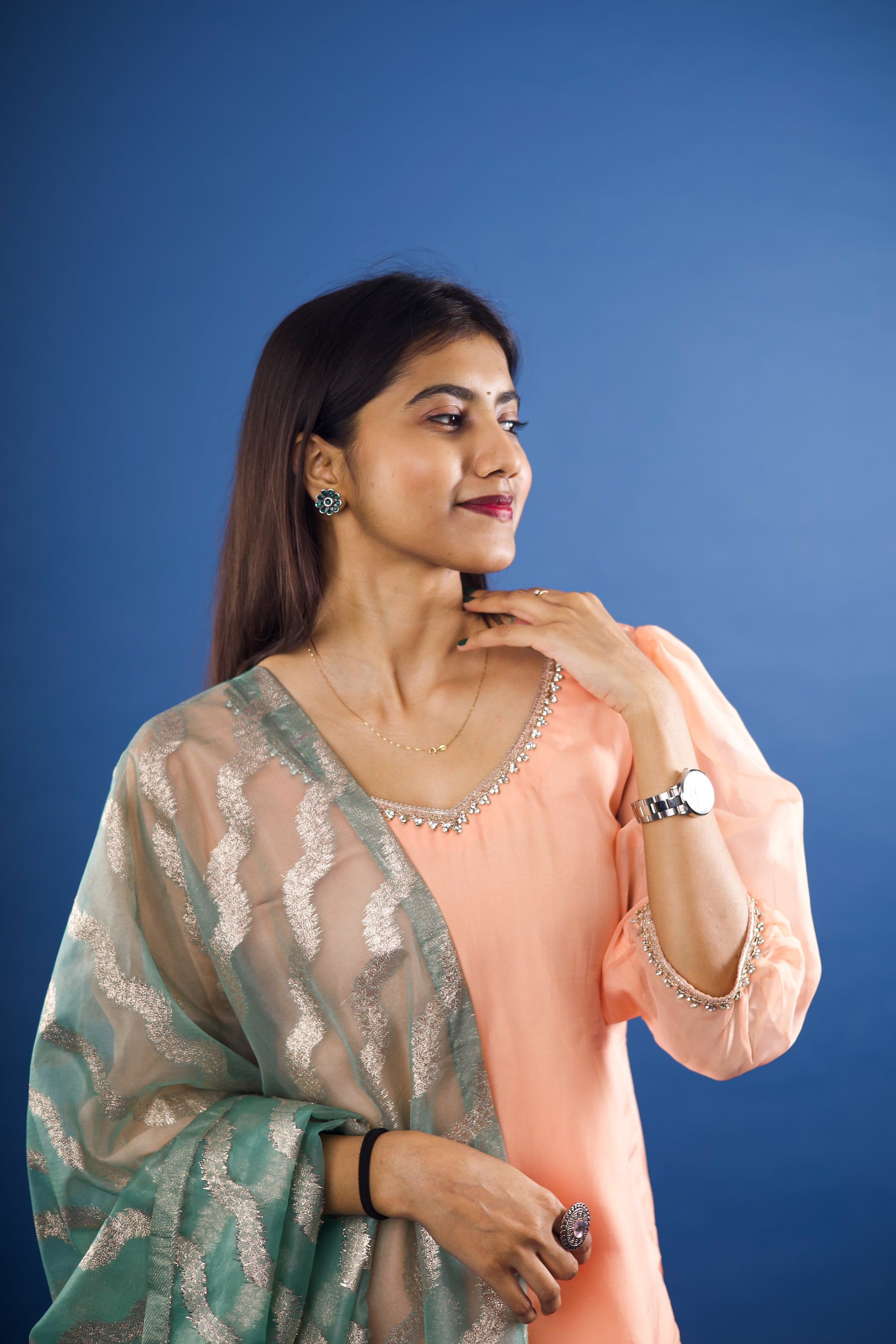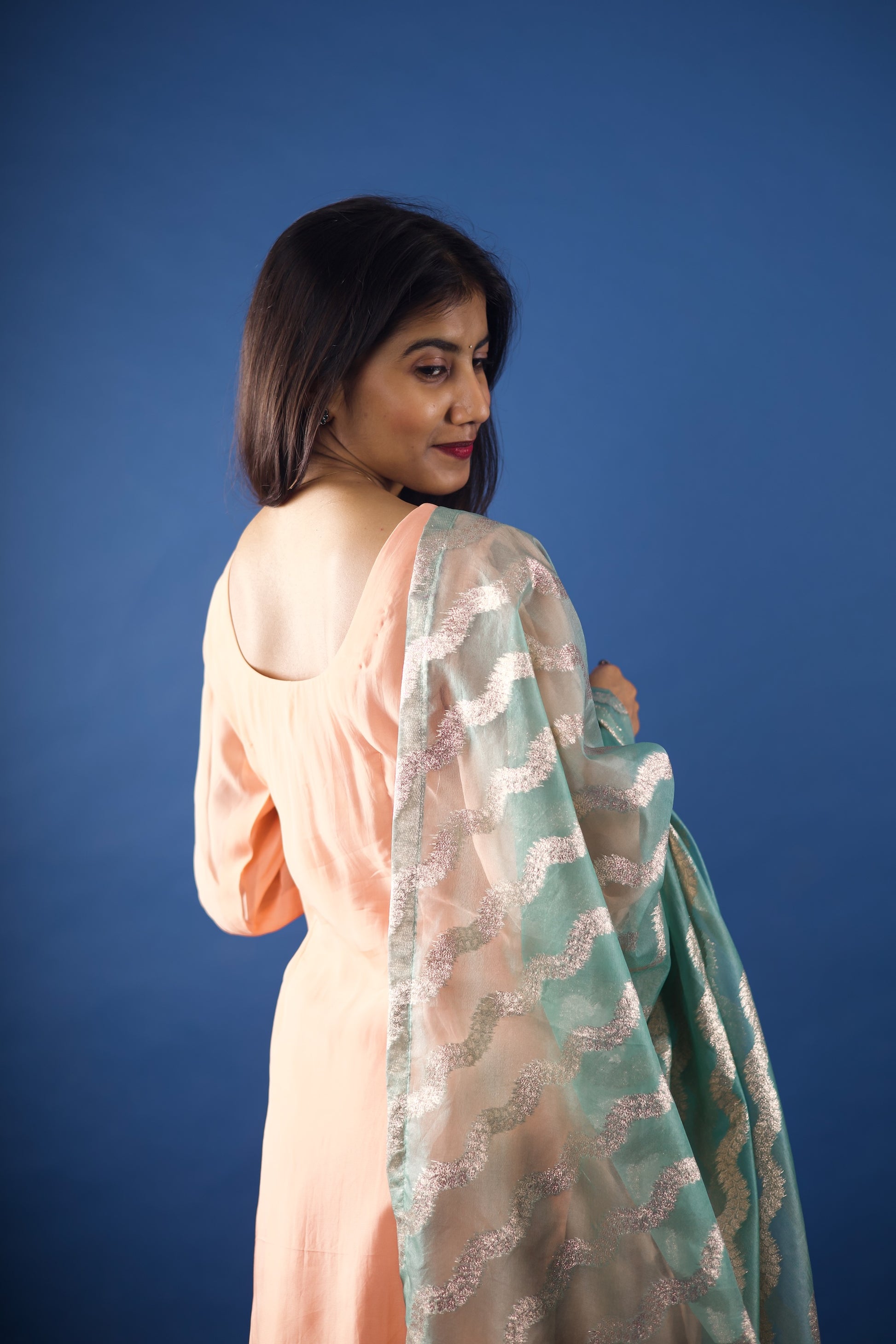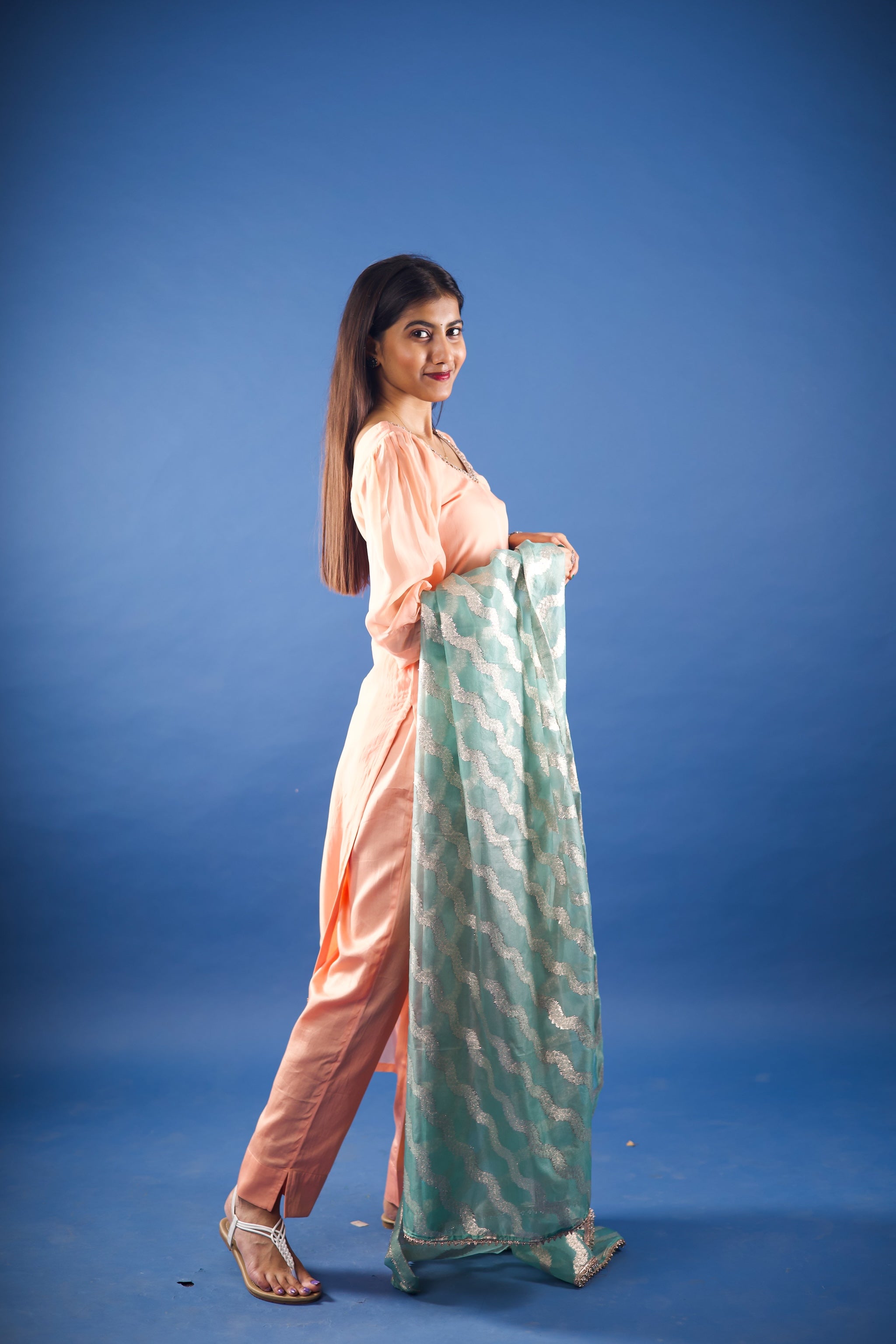 This exquisite Blushy Peach Minty Aqua Suit Set is the epitome of sophisticated charm. The A-line kurta is crafted from a premium quality silk fabric in a gentle blushy peach shade, offering a luxurious feel and a beautiful, elegant drape. The kurta's neckline is a clean and classic design, with a simple front that gracefully complements the deep scoop neckline at the back, creating a striking silhouette that looks beautiful from every angle.